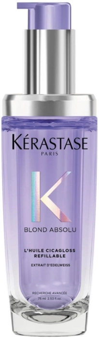 KÉRASTASE Kérastase Blond Absolu Aceite L'Huile CicaGloss 75 ML Recarga está especialmente formulado para cabellos rubios, decolorados o con mechas que necesitan reparación y luminosidad. Su fórmula ligera ayuda a fortalecer la fibra capilar, reducir la rotura y proteger frente a agresiones externas como el calor o la oxidación. Además, potencia el brillo natural del rubio y controla el encrespamiento, dejando una melena más suave, disciplinada y con un acabado glossy. Su formato recargable aporta un plus sostenible sin renunciar a la eficacia profesional. Si quieres cuidar tu rubio y comprar Kérastase barato, en BeautyHair.es tienes este imprescindible de KÉRASTASE Online.