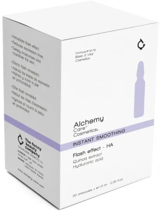 Ampollas concentradas de efecto flash monodosis con extracto de quinoa y ácido hialurónico ideales para aplicar cuando se tiene un evento, fiesta u ocasión especial; borrando signos de cansancio, alisando y suavizando la piel a la vez que la mantiene hidratada y jugosa.