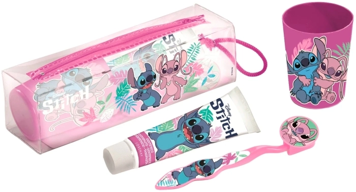 Este kit de higiene dental para niños incluye cepillo de dientes, pasta dental, vaso y estuche transparente con cierre, todos decorados con diseños de Lilo y Stitch que facilitan la identificación del producto y hacen más divertida la rutina de cepillado.