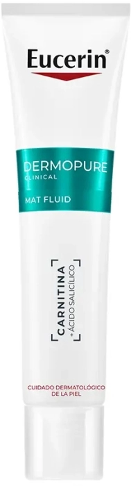 El Fluido Matificante DermoPure Clinical Mat de Eucerin es un producto dermatológicamente recomendado para el cuidado de la piel acnéica. Controla el sebo durante un periodo de hasta 8 horas. Su fórmula clínica combina Carnitina y Ácido Salicílico, lo que permite absorber el exceso de grasa. Es un producto unisex que se enfoca en la preocupación de los granitos, proporcionando una solución para mantener la piel libre de brillos. Se sugiere aplicar el fluido dos veces al día sobre la piel seca, después de utilizar el Gel Limpiador Purificante DERMOPURE.