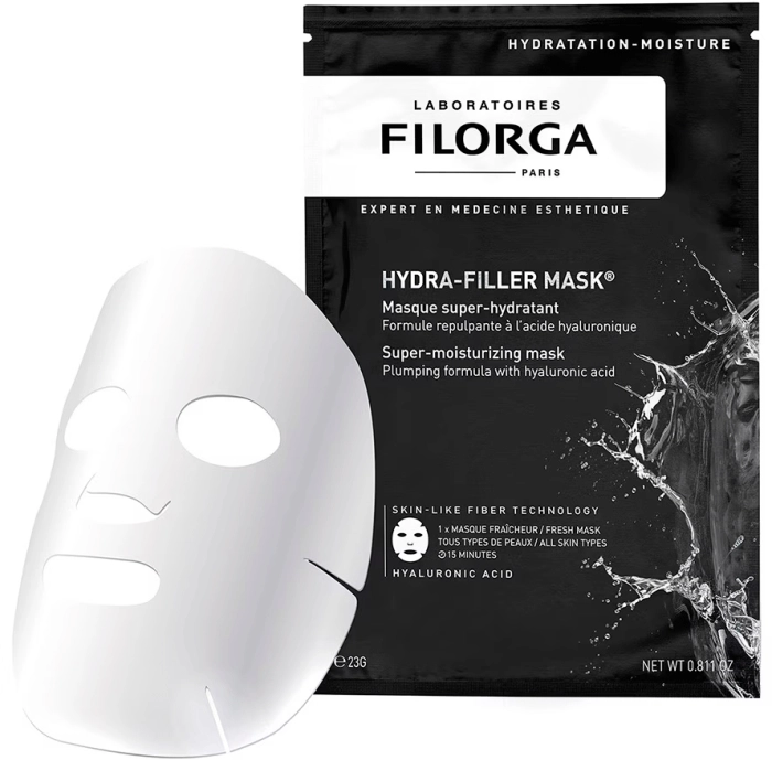 La mascarilla facial monodosis Hydra-Filler Mask de Filorga es un tratamiento diseñado para todo tipo de piel. Proporciona una hidratación intensa gracias a su formulación que incluye ácido hialurónico, un agente rellenador eficaz, y factores naturales de hidratación que aportan agua a la piel. Su uso genera un efecto de segunda piel en 15 minutos. Además, contiene aloe vera, que aporta vitaminas, minerales y oligoelementos, contribuyendo a la reactivación de la piel y restaurando su luminosidad. Para su aplicación, se debe abrir el sobre, desplegar la mascarilla y colocarla sobre el rostro limpio, dejándola actuar durante 15 minutos. Al finalizar, se recomienda masajear el excedente de sérum con la yema de los dedos, sin necesidad de aclarar. Se puede repetir el tratamiento de 1 a 2 veces por semana.