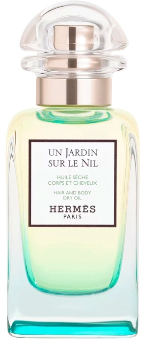 El aceite seco para cuerpo y cabello Un Jardin sur le Nil de Hermès es un tratamiento corporal unisex que ofrece una experiencia sensorial evocadora de los jardines de Asuán en Egipto. Proporciona un brillo satinado a la piel y un delicado aroma. Su textura ligera permite una rápida absorción, dejando la piel suave y sin sensación grasa. El cabello queda perfumado y sedoso. La fragancia incluye notas de mango verde, loto y sicomoro, creando una esencia verde y amaderada. El frasco, diseñado por Fred Rawyler, presenta un diseño inspirado en faros de coches antiguos y un degradado que recuerda las orillas del Nilo.
