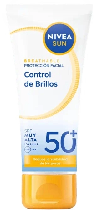NIVEA SUN Protección Facial UV Control de Brillos Transpirable SPF 50+ combate el fotoenvejecimiento sin obstruir los poros. Control de brillos durante más de 12 horas y reduce la visibilidad de los poros mientras protege la piel de los rayos UV.