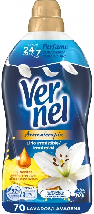 Relájate con el aroma de un ramo de lirios frescos. El suavizante de ropa Vernel Aromaterapia Lirio Irresistible, te regala una experiencia de fragancia irresistible durante 24 horas y hasta 7 días gracias a su fórmula con aceites esenciales.